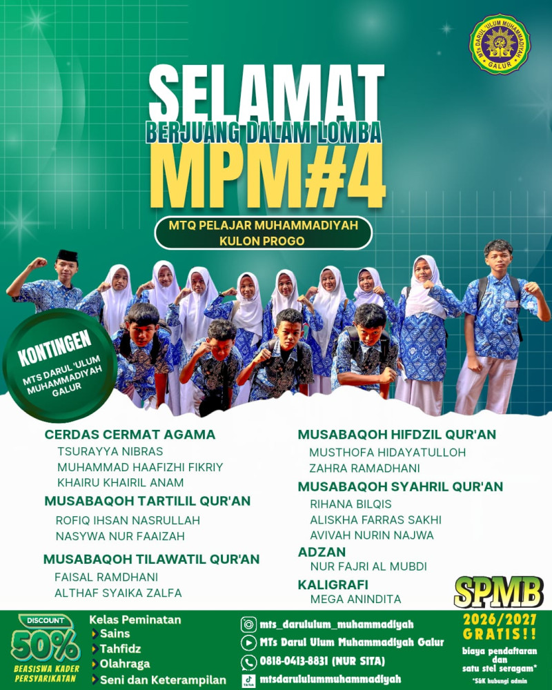 Kulon Progo— MTs Darul Ulum Muhammadiyah Galur mengirimkan kontingen terbaiknya untuk mengikuti MTQ Pelajar Muhammadiyah (MPM) ke-4 tingkat Kabupaten Kulon Progo yang diselenggarakan di SMK Muhammadiyah 3 Wates pada Sabtu, 17 Januari 2026. Kegiatan ini menjadi ajang kompetisi sekaligus pembinaan pelajar Muhammadiyah dalam bidang keagamaan, khususnya Al-Qur’an, serta penguatan karakter Islami.